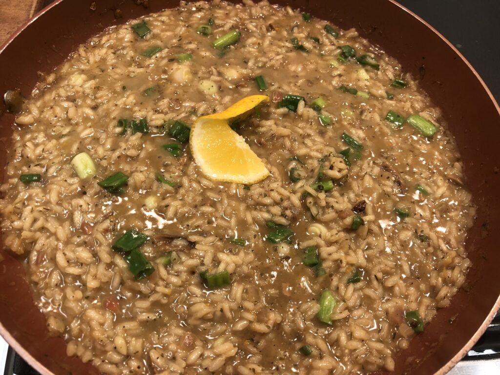 1 ½ c. Arborio rice or 1 (8.8 oz.) packaged Risotto (I used Cucina Viva Risotto with Porcini Mushrooms)-bought at Champagne’s in Lafayette.