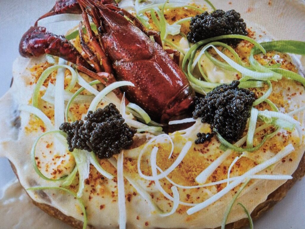 Garnish: Cajun Caviar, sliced green onion, boiled crawfish