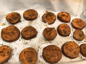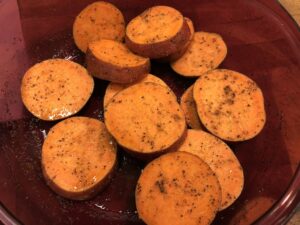 4. In large bowl, combine olive oil, melted butter and all the seasonings. Add yam slices and toss to evenly coat.