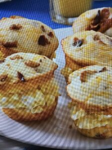 17. Cut muffins in half and spoon eggs over bottom halves.