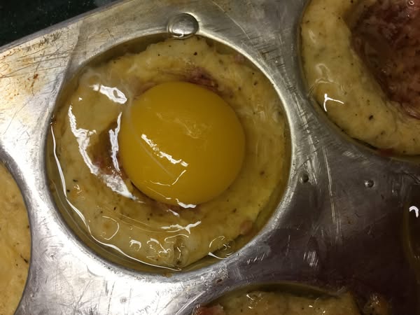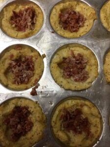 11. Remove from oven and place about 1 T. crumbled bacon into each well and carefully crack an egg and place one in each of the muffin cups.