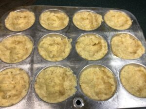 9. Place equal amounts of the cauliflower mixture into the well of the muffin tin and mash the bottom and up the sides that it forms a cup.