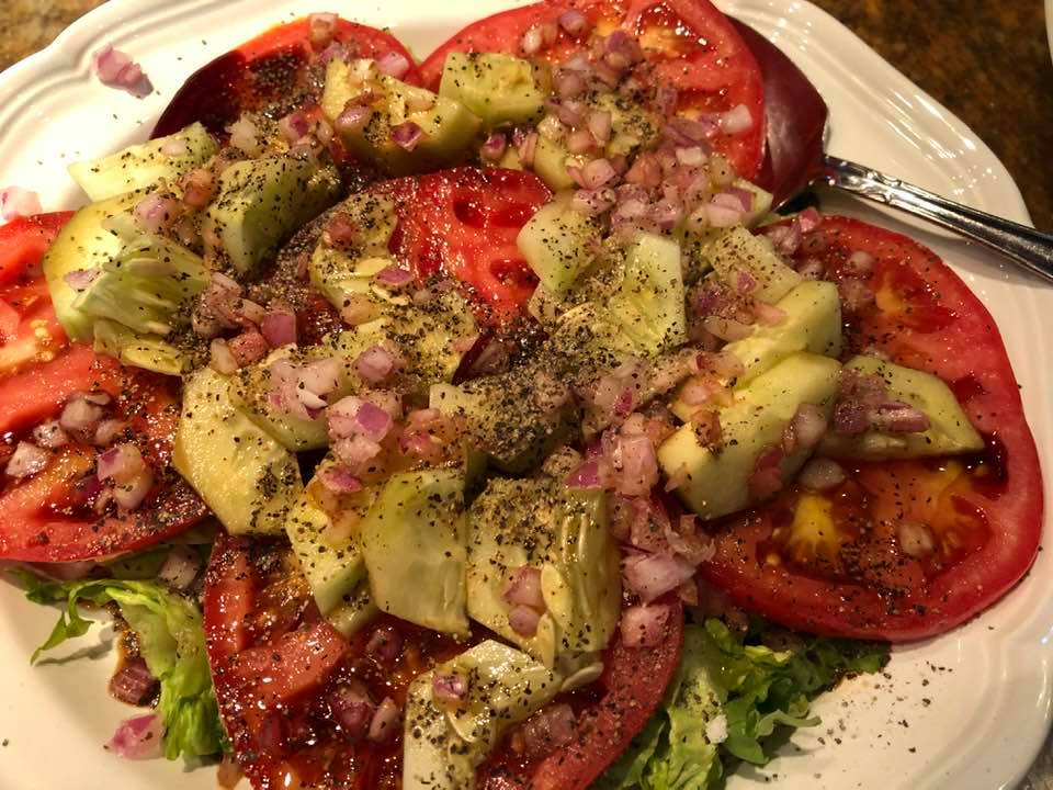 Grilled Catfish; Crawfish Etouffee with Corn Stuffed Bell Peppers, topped with a few Crawfish Bisque Stuffed Heads(heads from a great friend). Creole Tomatoes with home grown cucumbers. Oh yes gonna love this !