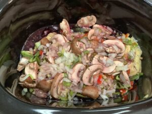 2. Mix together the soup, ranch dressing, mushrooms, celery, bell pepper, onion and green beans.