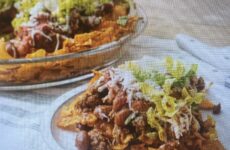 FAN-FAVORITE NACHO PIE4 c. Nacho Cheese Tortilla Chips, coarsely crushed1 lb. ground beef½ c. chopped onion1 (16-oz.) can chili beans, undrained, warmed1 (8-oz.) can salsaSalt/black…