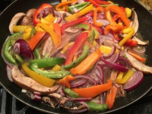 8. Saute the onions, bell peppers and mushrooms until tender.