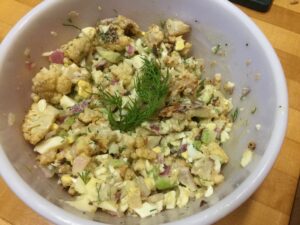 6. In a bowl, combine the baked cauliflower with the chopped eggs, red onion and celery. Mix well.