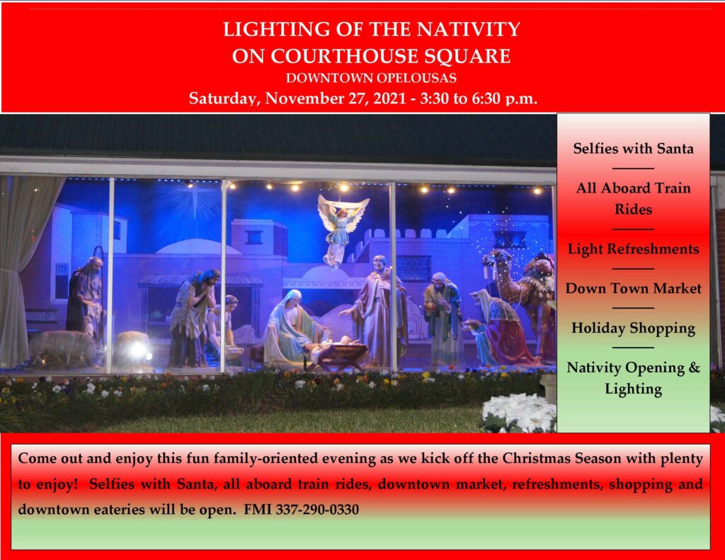 TAKE NOTE: THE LIGHTING OF THE NATIVITY will take place on Saturday, November 27th from 3:30-6:30 pm. It is a great event to bring your family to witness. There will be activities for the children to do along with taking selfies with SANTA. The DOWNTOWN MARKET VENDORS will be on site and most of the food/beverage places around the COURTHOUSE SQUARE will be open. The WALKING LADIES are presently working on putting permanent lighting of the oaks. We can no longer wrap the trees due to the heavy equipment that is necessary to put the lights on. The heavy equipment was damaging the root system. Unfortunately, we will not have the permanent lighting this coming year. As we all know, products/services are hard to come by. Hopefully, we will have this done soon. The PERMANENT LIGHTING WILL BE USED TO SHOW OFF ALL THE BIG HOLIDAYS THROUGHOUT THE YEAR!