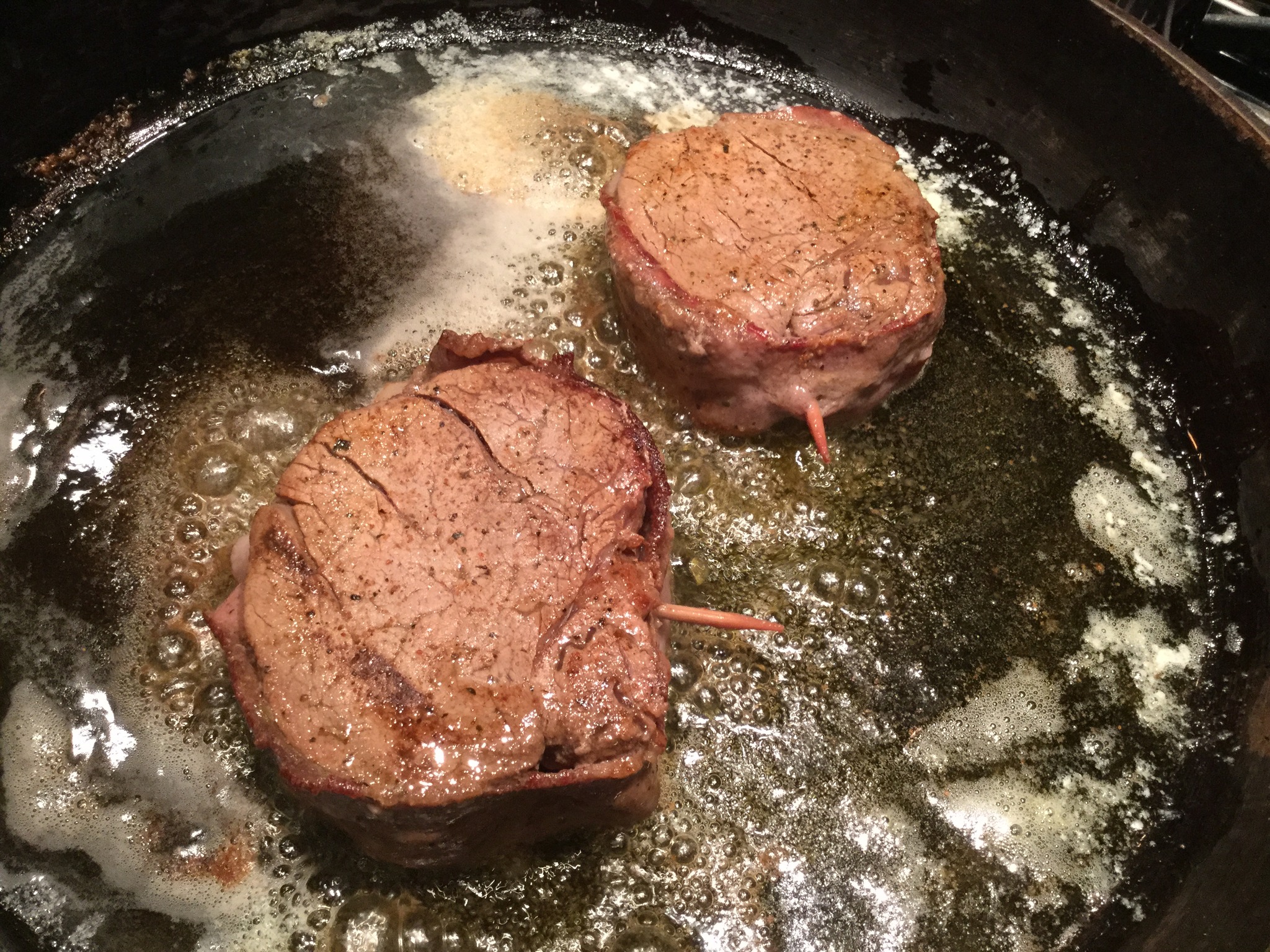2 (8-10-oz.) beef filet mignons, wrapped in bacon, 2” thick