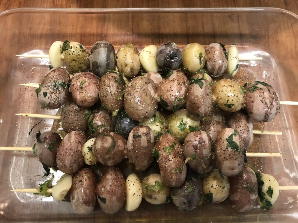 - Grill potatoes until charred on both sides, 2-3 minutes per side or just heat in 300 oven.