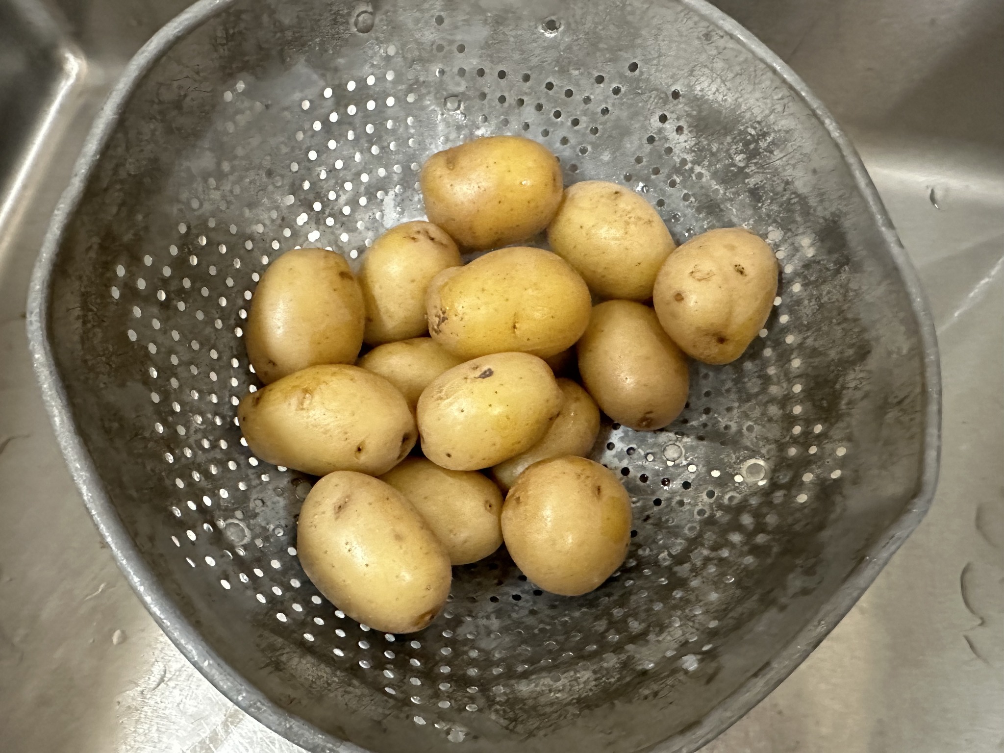 - POTATOES: Place potatoes in salted water and let come to a boil for about 10 minutes. Drain.
