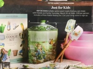 Some of the Williams-Sonoma stores are offering a “PETER RABBIT EASTER BAKING CLASS”. It shows that it will be March 10th starting at 10:00 AM, at a cost of $30/child. Hop on down to bake some sweet treats that you can share with friends and family. Perfect for springtime celebrations. With the PETER RABBIT BAKING COLLECTION, you can re-create your favorite storybook scenes as playful homemade, yummy treats!